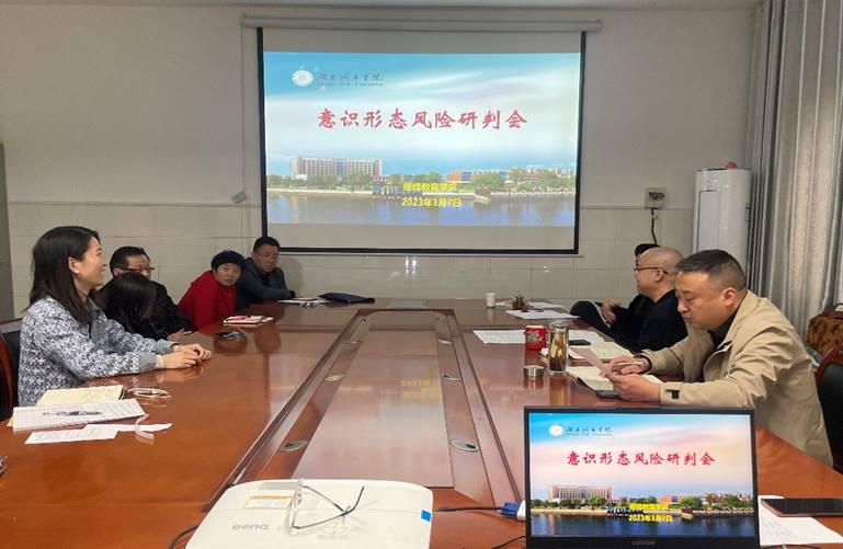 2023年3月7日下午,我院在学院会议室召开意识形态风险研判会议,在传达全省疫情防控第二次视频会议精神、布置我院2023年意识形态工作的基础上,研判和分析新学期开学阶段意识形态领域出现的新情况、新问题。本次会议由学院直属党支部书记熊兴吾主持,全院教职工及各办学机构负责人共同参加。